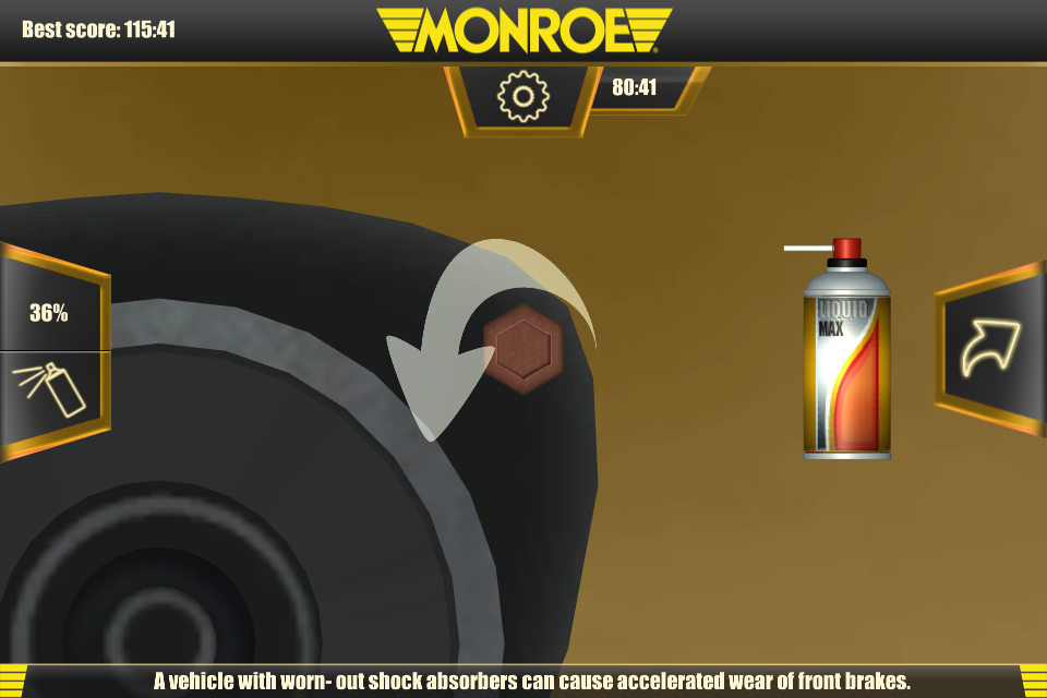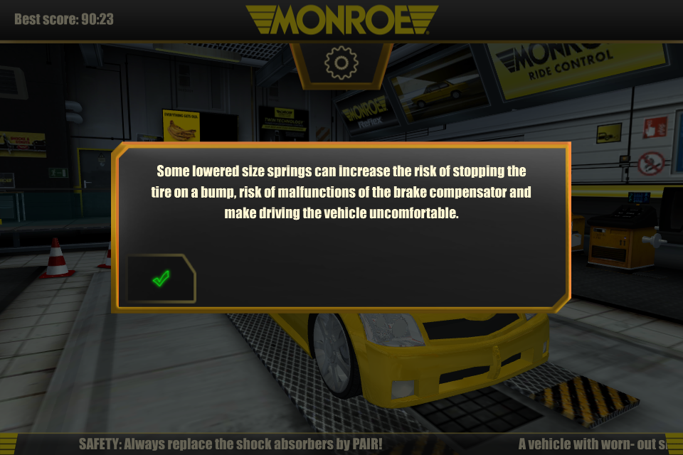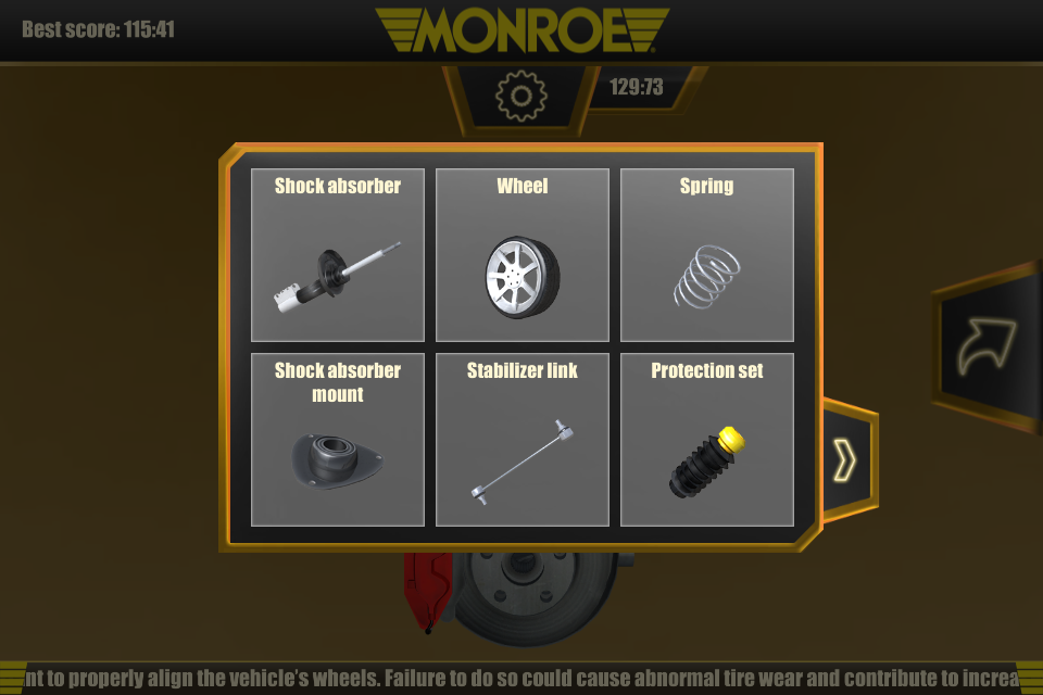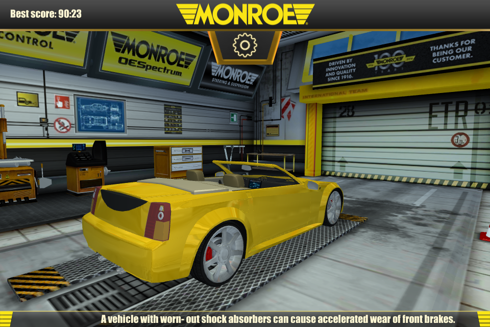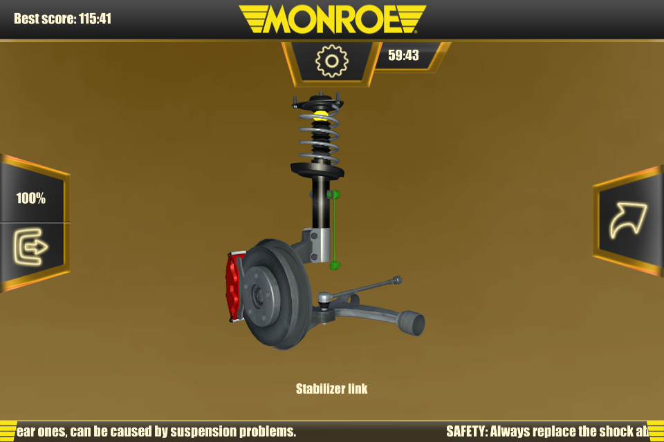 Твоим заданием является достижение лучшего показателя времени при замене амортизаторов в транспортном средстве. Если Тебе удастся закончить это задание быстрее, чем за 100 секунд, то Твой результат будет записан и Тебе представится возможность побороться за титул Всемирного Рекорда!