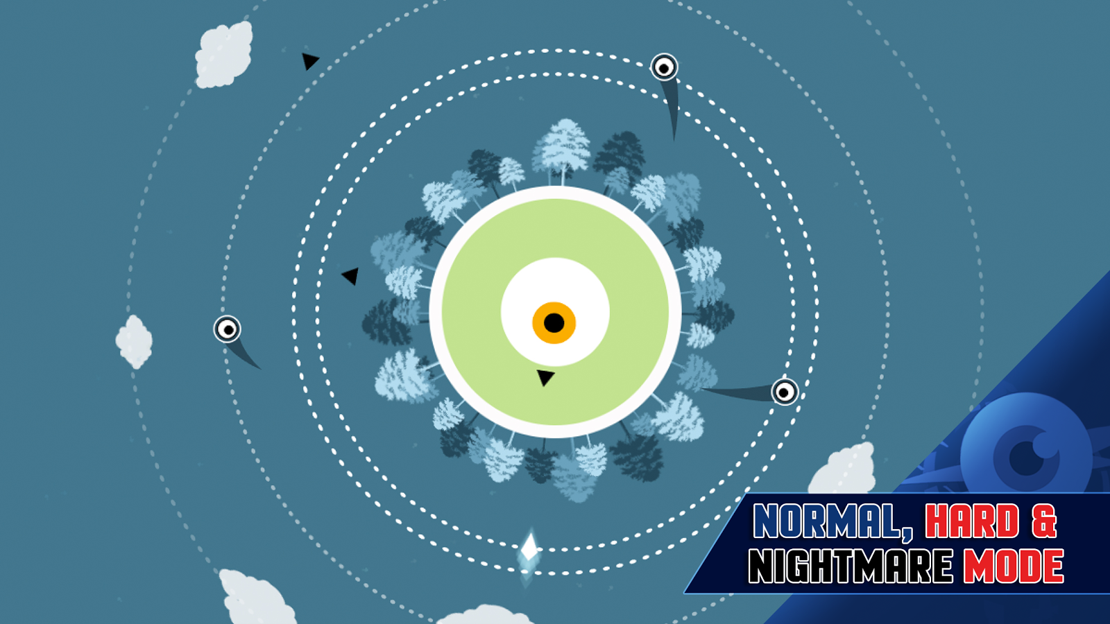 Zero Reflex – хардкорная динамичная игра на андроид, где вам предстоит управлять стрелкой. Ваша стрелка движется по кругу, в центре которого расположен магический глаз, который любыми путями хочет вас уничтожить. Вашей главной задачей будет пройти достаточное количество пути, преодолевая все препятствия и избегая столкновений с ракетами и смертельным дымом. Внимательно следите за всем происходящим на экране и воспользуйтесь отличной реакцией, чтобы пройти уровень. Если вы столкнётесь с препятствием, то игра для вас начнется заново. Пройдите более 80 уровней и установите свой рекорд по скорости их прохождения.
