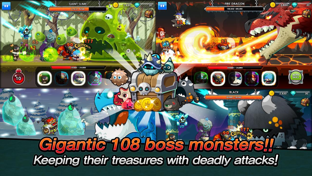 108 Monsters – соберите свой отряд отважных героев и приведите их к победе над могущественными боссами. Путешествуйте по сказочному миру и нападайте на монстров, уничтожая их и получая за это награду. Исход вашей битвы с врагами будет напрямую зависеть от скорости ваших пальцев и состава вашего отряда. Нажимайте на экран своего девайса как можно быстрее и поражайте врагов магическими заклинаниями, пушками, мечами, лазерами и другим оружием. Каждый герой обладает уникальными способностями и оружием, применяйте их способности в бою и получайте несметные сокровища. Улучшайте своих героев и пополняйте отряд новыми.