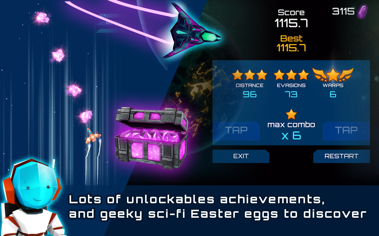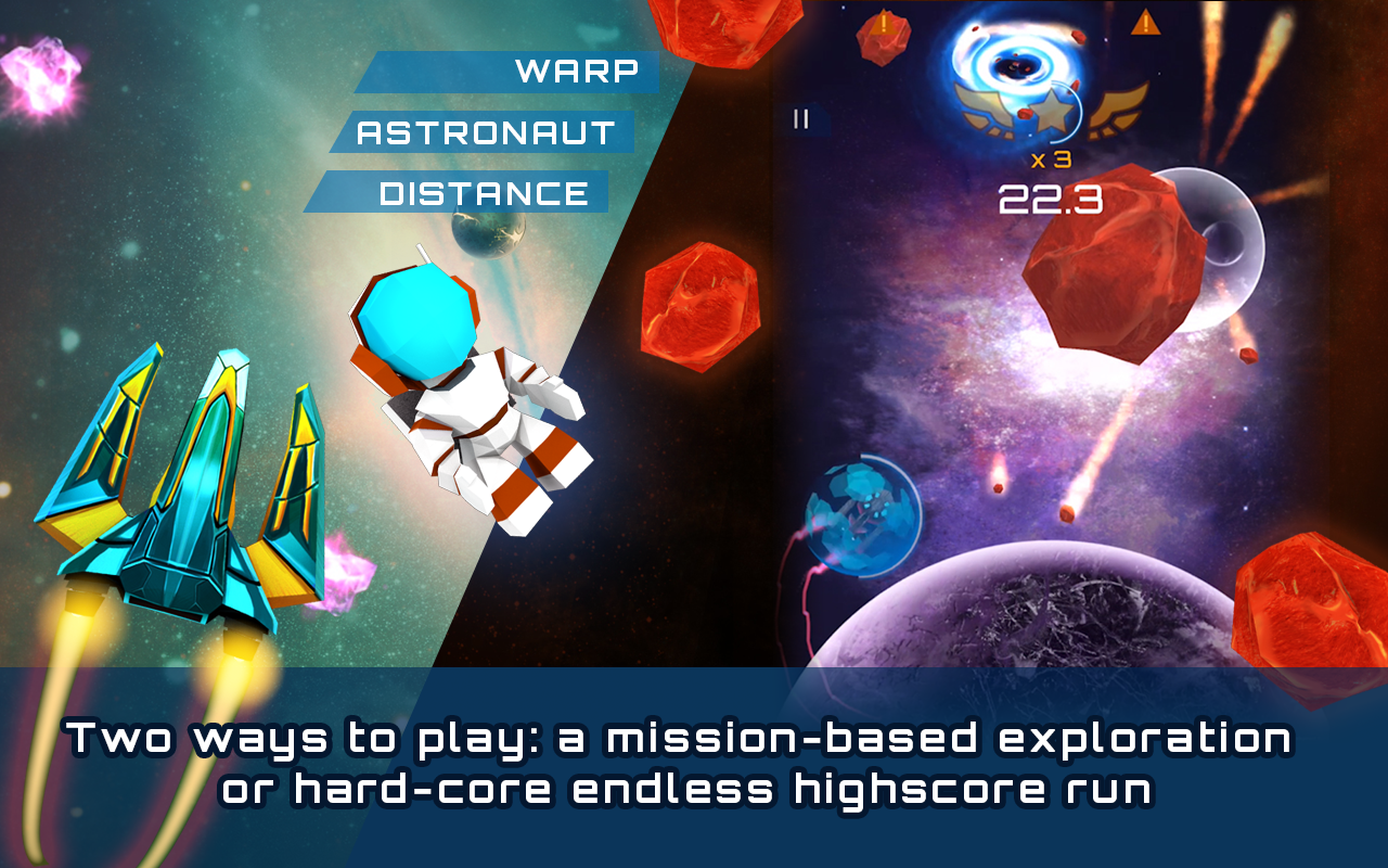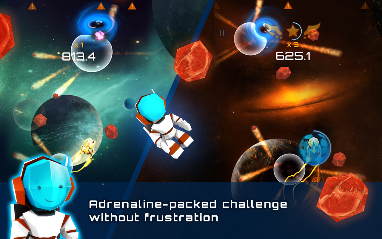 Hyperide – космическая игра на андроид, где вы возьмете под свой контроль космический корабль. В этой игре вы будете управлять кораблем и лететь через большое количество астероидов. Отличительной особенностью этой игры является то, что вам не придется стрелять по многочисленным астероидам, а стараться обойти их и собрать по пути всех астронавтов. Бороздите бескрайние просторы вселенной и перемещайтесь через черные дыры, сокращая себе путь и оказываясь на другом конце вселенной. В игре присутствует два режима игры: выполнение опасных миссий и бесконечный хардкор. Разблокируйте все достижения и откройте для себя многочисленные космические корабли.