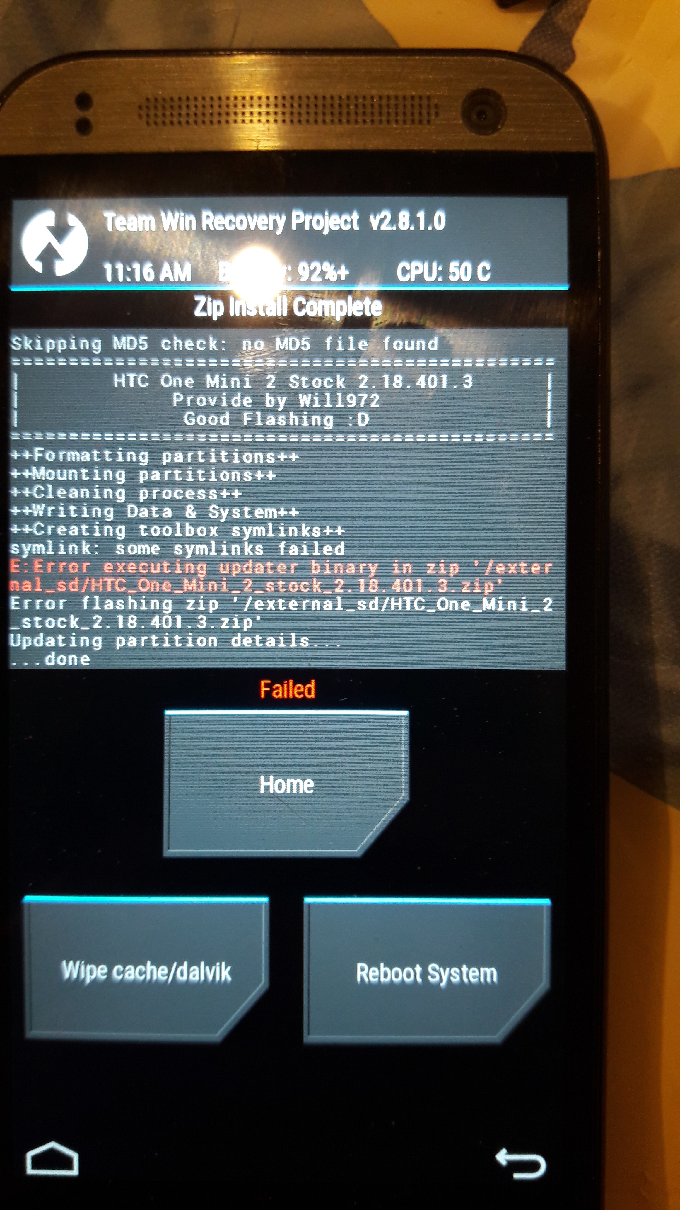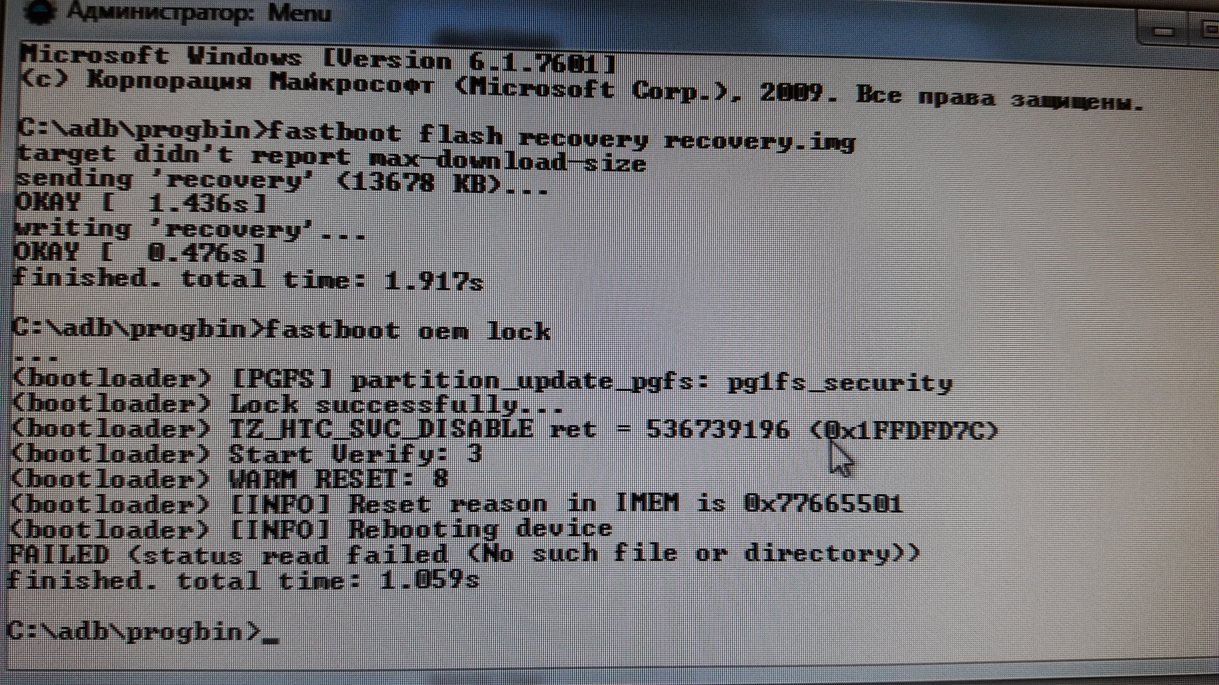 по логу закрытия загрузчика - тут мне не очень ясно, вроде как он закрылся, но после этого какие-то ошибки в логе, статус, как я понимаю судя по скриншоту с hboot остался прежним, т.е. загрузчик открыт, первый раз сталкиваюсь с таким, что не закрывается загрузчик