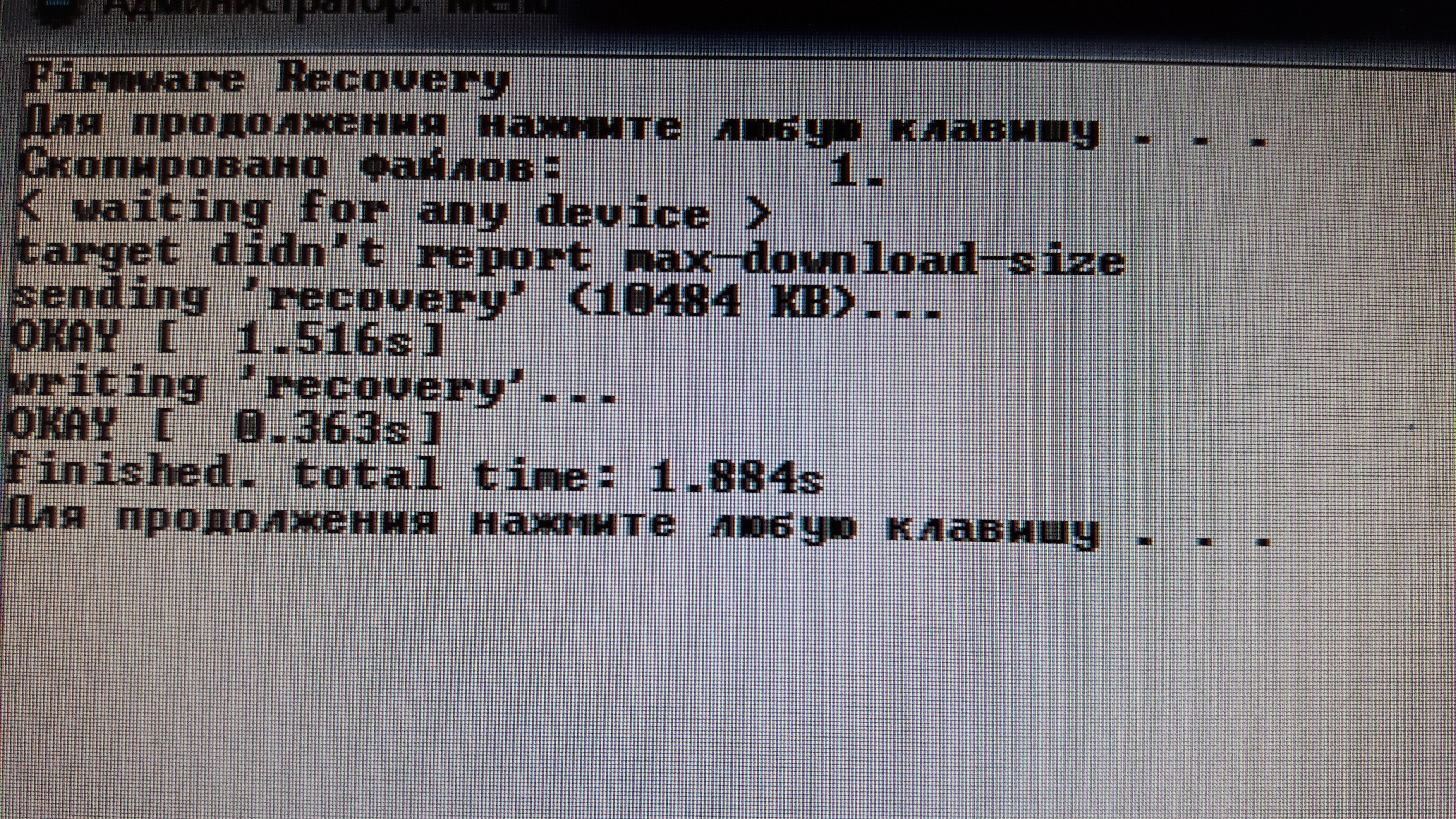 strupy, по логу у тебя рекавери прошилось, если ты туда положил стоковое рекавери (C:/adb/progbin), то оно должно было и прошиться