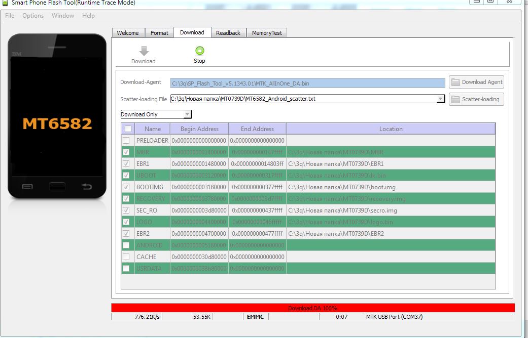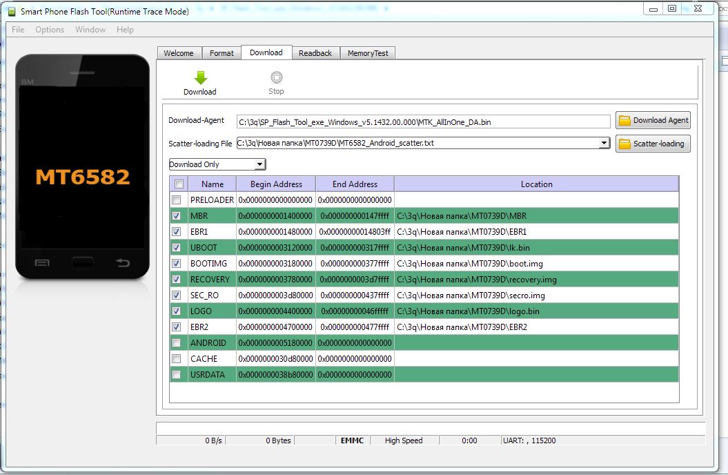 -Нажать на кнопку "Scatter-Loading" (с правой стороны) и выбрать из папки с прошивкой файл "MT6582_Android_scatter_emmc.txt"