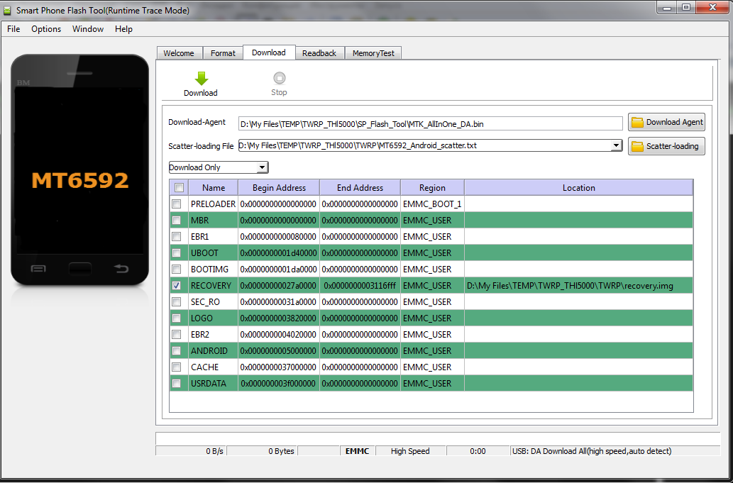 6. Нажимаешь на кнопку scatter-loading и выбираешь файл MT6592_Android_scatter.txt из папки TWRP.