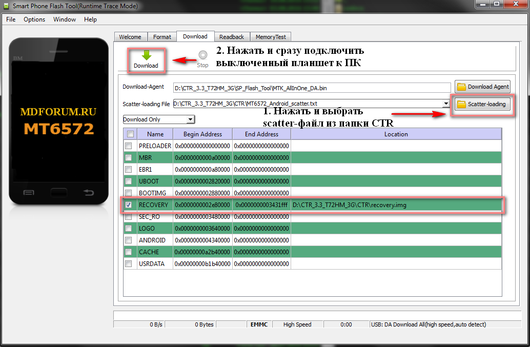 1. Скачать архив CTR_3.3_T72HM_3G.rar, распаковать. Поместить архив SuperSU-v2.62-pro.zip в корень внутренней памяти планшета. 2. Установить драйвера из архива MTK_USB_All_1.0.2.zip 3. Выключить планшет. 4. Запустить SP Flash Tool. (flash_tool.exe) 5. Нажать кнопку scatter-loading и выбрать файл MT6572_Android_scatter.txt из папки CTR. 6. Нажать кнопку Download и сразу подключить выключенный планшет к ПК. Дождаться окошка с зелёной птичкой. Отключить планшет от ПК.