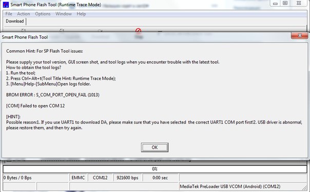 Зарядился до 100% индикатор зелёный , переподключил одна и та же картина попробовал зайти в режимы даже хрен знает какие у режимы у этой сраной китаянки, сначала зажал три кнопки ( громкость вверх , громкость вниз , кнопка включения ) вроде что то отобразилось в винде по поводу прелоадера ( треугольник ошибка запуск невозможен ) и (MediaTek PreLoader USB VCOM Port), SP Flash Tool выдаёт ошибку по COM порту в итоге прошивка не пошла перезагрузил, попробовал зажать две кнопки громкости , не помогает и происходит одно и тоже или даже перекидывает на китайский Factory Mode,