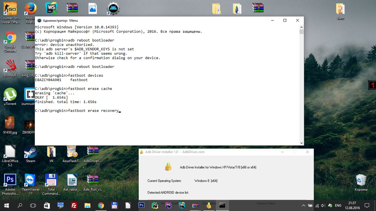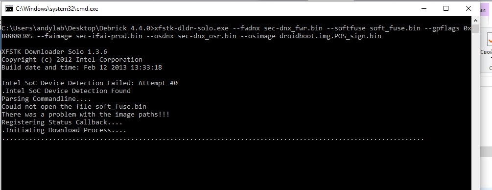 . Оно выключается через некоторое время, на телефоне появляется лого Intel inside и экран превращается в белый полностью. Пробую дальше запустить Start.cmd, ввожу fastboot flash fastboot fastboot.img как написано в инструкции, но выходит надпись < waiting for device >..