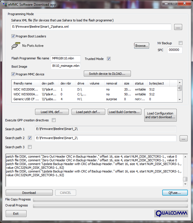 6)Устанавливаем драйвера из шапки темы, в eMMC Software Download убираем галочку с Program Boot Loaders, в списке девайсов выбираем наш Qualcomm mmc storage и нажимаем Download. Ждем когда зеленые полоски проползут до конца и программа скажет все готово и вуаля, девайс опять жив! НО! есть одно но... Имея уже нету, придется восстанавливать...