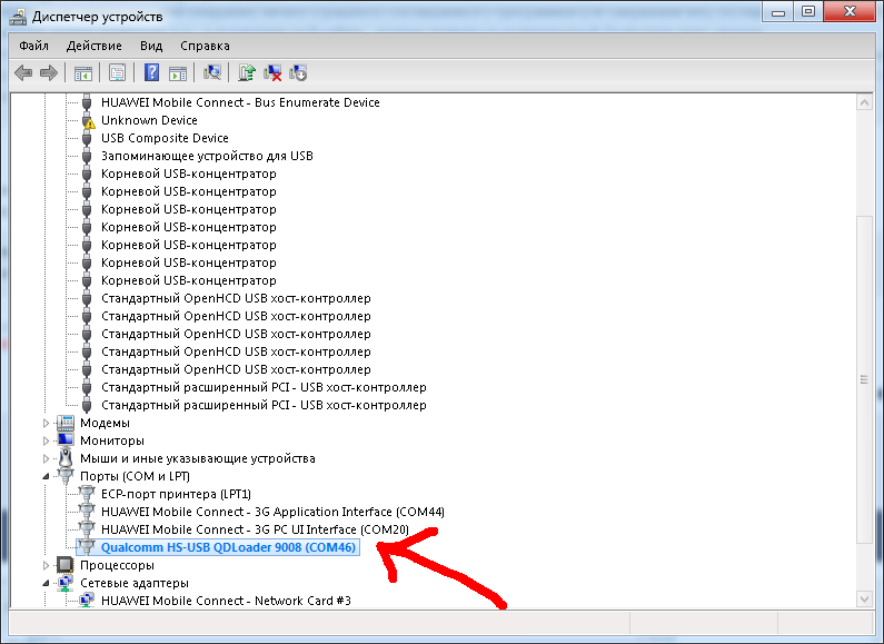 3)Видим новое устройство - QHSUSB_BULK, устанавливаем драйвер (прикреплен внизу), получаем - Qualcomm HS-USB QDloader 9008 (COM...).