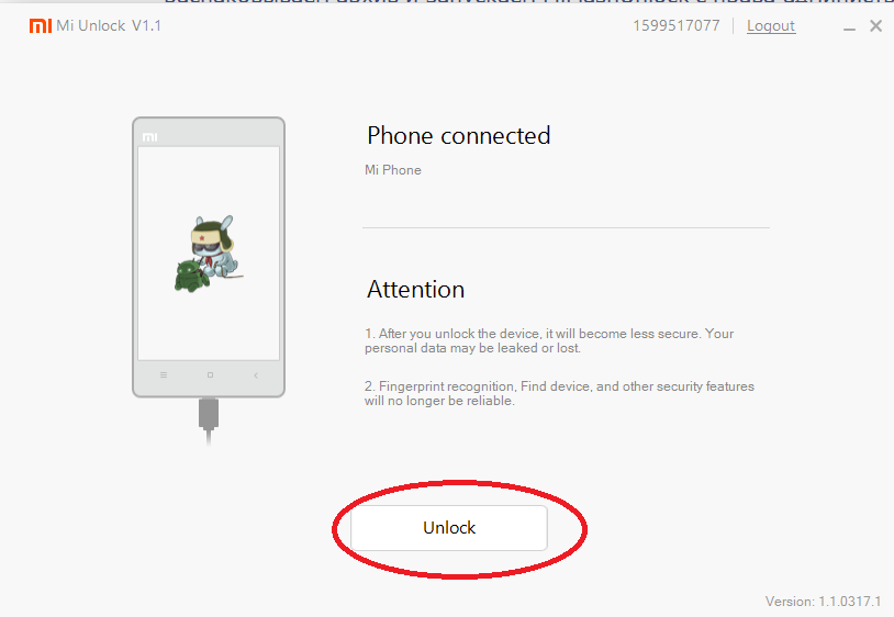 6. В утилите Mi Unlock нажимаете на кнопку Unlock и дожидаетесь окончания разблокировки.