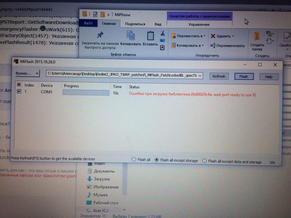 6. Запустить MiFlash, нажать кнопку Browse и выбрать папку _MiFlash_PatchLockedBL_specTWRP (каталог находится в папке Redmi3_3PRO_TWRP_patched), затем нажать кнопку Refresh, должен будет появиться порт - после чего нажать кнопку Flash, прошьётся патченный uboot и TWRP recovery. В конце у вас должно будет написано The operation completed successfully.