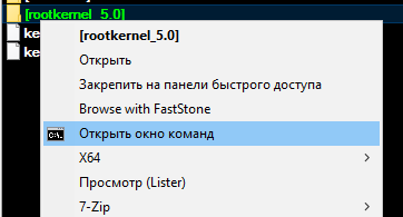 5. Зажимаем shift на клавиатуре и не отпуская его кликаем по папке rootkernel правой кнопкой мыши, в меню выбираем "Открыть окно команд"