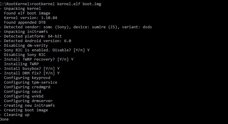 8. После того, как скрипт отработает в папке с rootkernel появится файл boot.img (это и есть стоковое ядро с внесёнными изменениями). Забираете его оттуда и прошиваете с помощью Flashtool или через fastboot командой fastboot flash boot boot.img