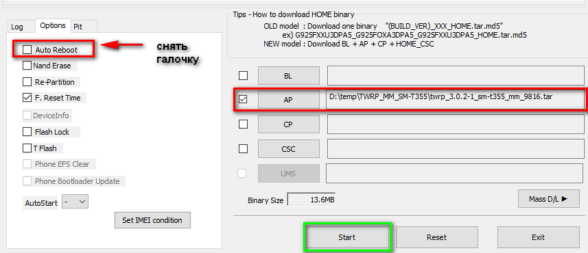 4. Запустить Odin.exe, перейти во вкладку Options и снять галочку с AutoReboot. Отметить пункт AP галочкой, нажать на кнопку и выбрать файл twrp_3.0.2-1_sm-t355_mm_9816.tar
