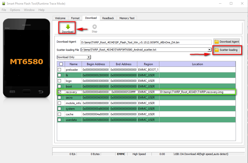 4. Отключить телефон от ПК. Достать и вставить батарейку, не включать и не подключать к ПК. 5. Запустить Sp Flash Tool (flash_tool.exe), нажать на кнопку scatter-loading и выбрать файл MT6580_Android_scatter.txt из папки TWRP. 6. Нажать кнопку Download и сразу подключить выключенный телефон к ПК, если драйвера установлены правильно, то процесс прошивки начнётся сразу после подключения. Дождаться завершения, в конце выскочит окошко с зелёной птичкой.