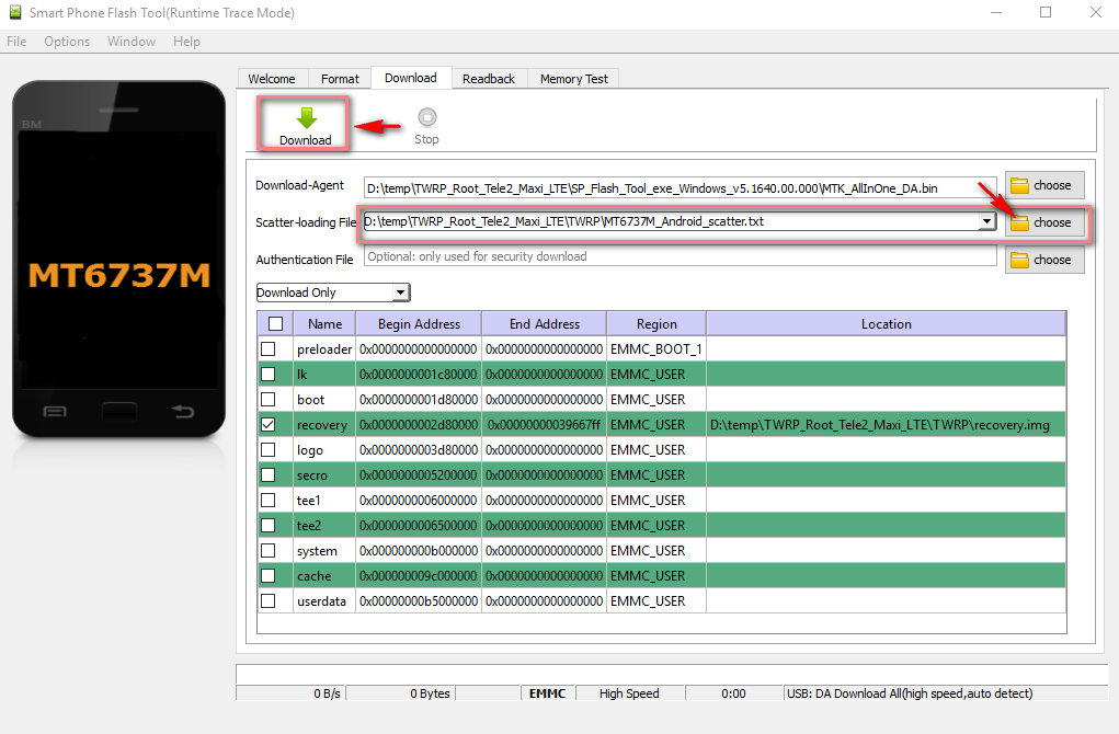 4. Запустить Sp Flash Tool (flash_tool.exe), нажать на кнопку choose на против поля scatter-loading и выбрать файл MT6737M_Android_scatter.txt из папки TWRP.