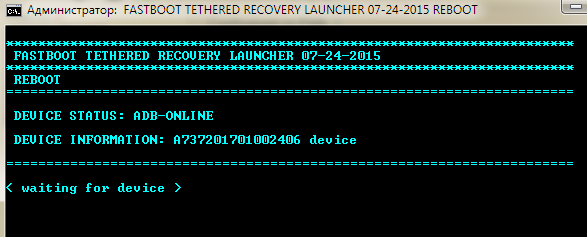 пробуй зажимать разные кнопки при включении и смотреть куда он грузится, в командной строке он должен быть виден по команде fastboot devices, т.е. находится в этом режиме, пока ты его туда не загонишь - будешь всё время видеть waiting for devices... в скрипте