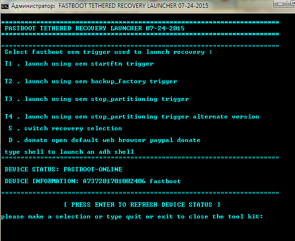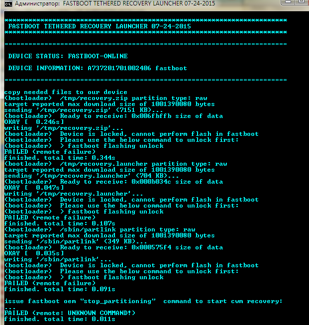 При этом, после команды adb reboot bootloader устройство не перезагрузилось и включилось, как и в прошлые разы, а как бы перезагрузилось и подвисло. Вижу, что экран немного подсвечен по бокам. Fish, что дальше? ))