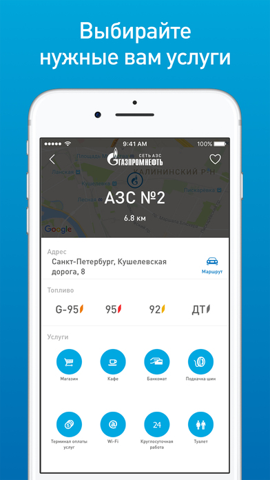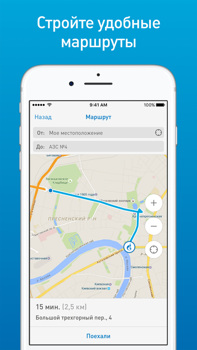 - поиск ближайшей АЗС сети «Газпромнефть» и прокладка маршрута;