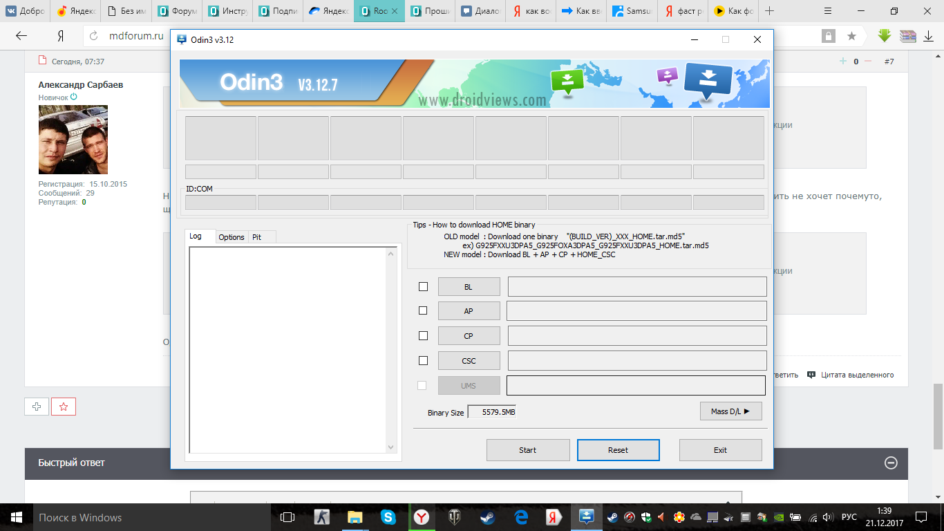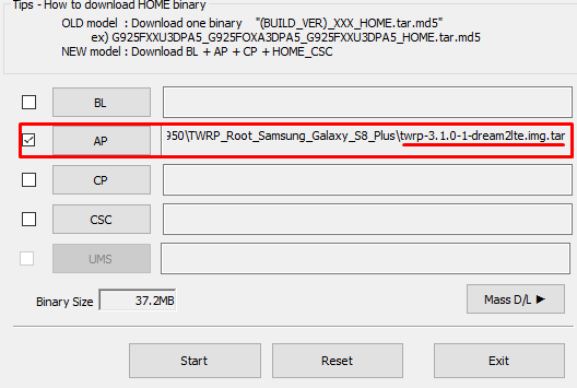 6. Запускаете Odin3 v3.12.7.exe. Нажимаете на кнопку AP в окне программы и выбираете файл twrp-3.1.0-1-dream2lte.img.tar