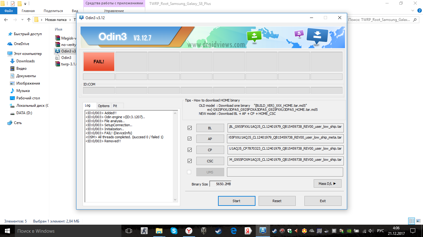 4. Скачать архив TWRP_Root_Samsung_Galaxy_S8_Plus.zip из вложения к посту, распаковать. Архивы no-verity-opt-encrypt-5.1.zip и Magisk-v12.0.zip поместить в корень карты памяти (на флешку).