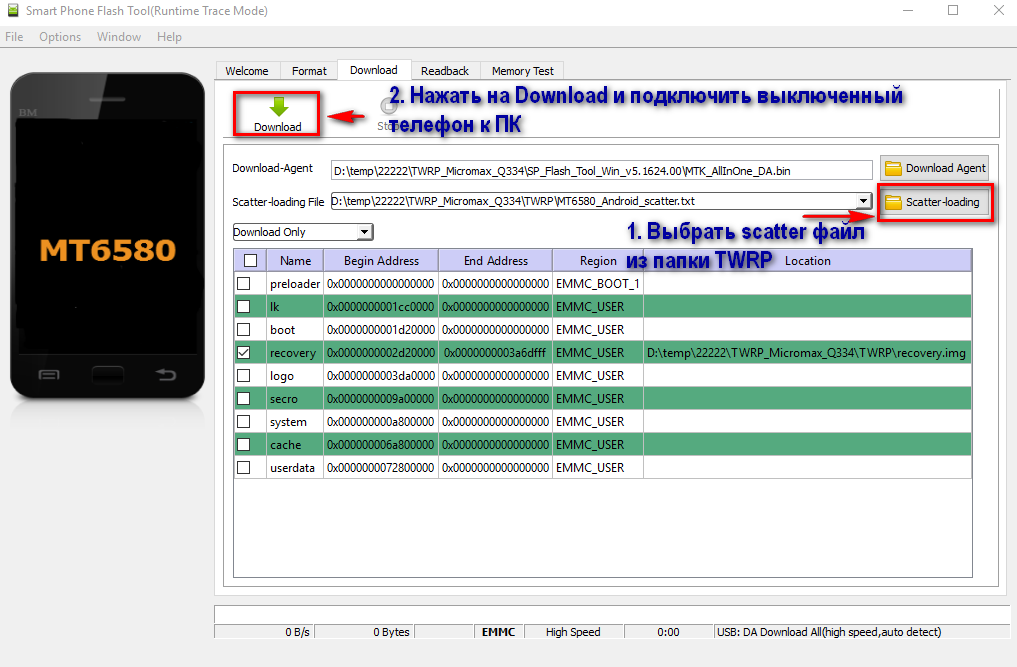 3. Запустить SP Flash Tool (flash_tool.exe), нажать кнопку scatter-loading и выбрать файл MT6580_Android_scatter.txt из папки TWRP.