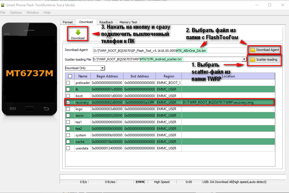 1. Скачать архив из вложения к посту (TWRP_ROOT_BQS5070.zip). Распаковать. 2. Поместить архив SuperSU.zip не распаковывая в корень карты памяти (на флешку). 3. Выключить устройство. Извлечь батарейку и отложить её в сторону. 4. Подключить смартфон к компьютеру без АКБ и установить USB VCOM драйвера | Инструкция. После установки драйвера телефон отключить, батарейку не вставлять. 5. Запустить SP Flash Tool (flash_tool.exe), нажать кнопку scatter-loading и выбрать файл MT6737M_Android_scatter.txt из папки TWRP. В поле Download agent выбрать файл MTK_AllInOne_DA.bin из папки SP_Flash_tool. Всё должно выглядеть так, как на скриншоте: