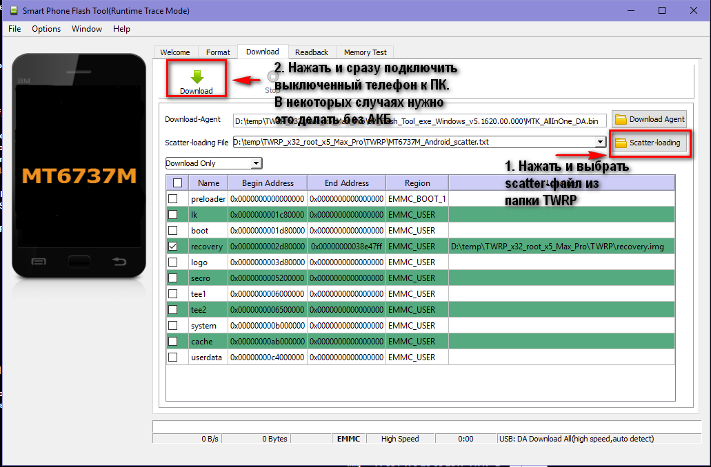 1. Скачать архив TWRP_x32_root_x5_Max_Pro.7z (прикреплён к посту), распаковать в удобное место на компьютере. 2. Зайти на телефоне в Настройки -> О телефоне и тапнуть пальцем 7 раз по Номеру Сборки, выскочит сообщение о том, что ты стал разработчиком. Далее зайди в Настройки -> Опции для разработчика и активируй там "Разблокировка OEM" (загрузчика) 3. Помести архив SuperSU-v2.78.zip в корень карты памяти телефона (на флешку), если флешки нет, то тогда во внутреннюю память. 4. Выключи телефон. Подключи его в выключенном состоянии к компьютеру и установи драйвер из папки SP_Driver_v5.1612.03, затем проверь (переподключи его) как он у тебя определяется в диспетчере устройств, должен определяться как MTK Preloader, если определяется некорректно, установи драйвер другим образом, вручную, по инструкции из этой темы: Как устанавливать USB VCOM драйвера для прошивки устройств на чипсете MT65xx через SP Flash Tool 5. Отключи телефон от ПК. Отложи в сторону. Смартфон должен быть выключен. 6. Запусти SP Flash Tool (flash_tool.exe), в открывшемся окне программы нажми кнопку scatter-loading и выбери файл MT6737M_Android_scatter.txt из папки TWRP