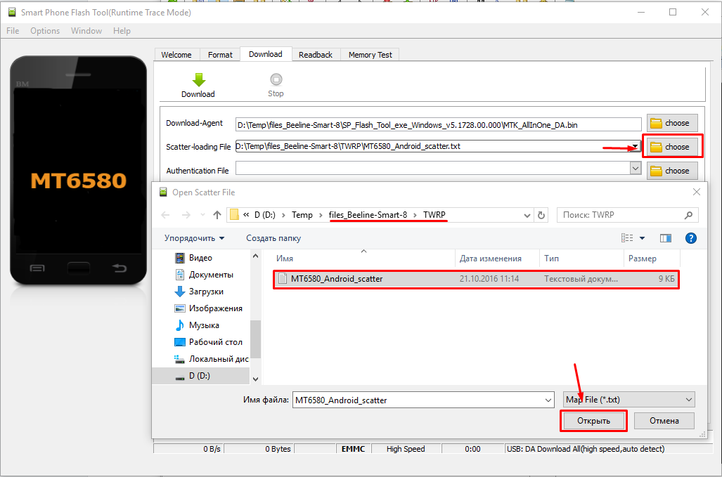 4. Нажать кнопку choose напротив scatter-loading и выбрать scatter-файл из папки TWRP