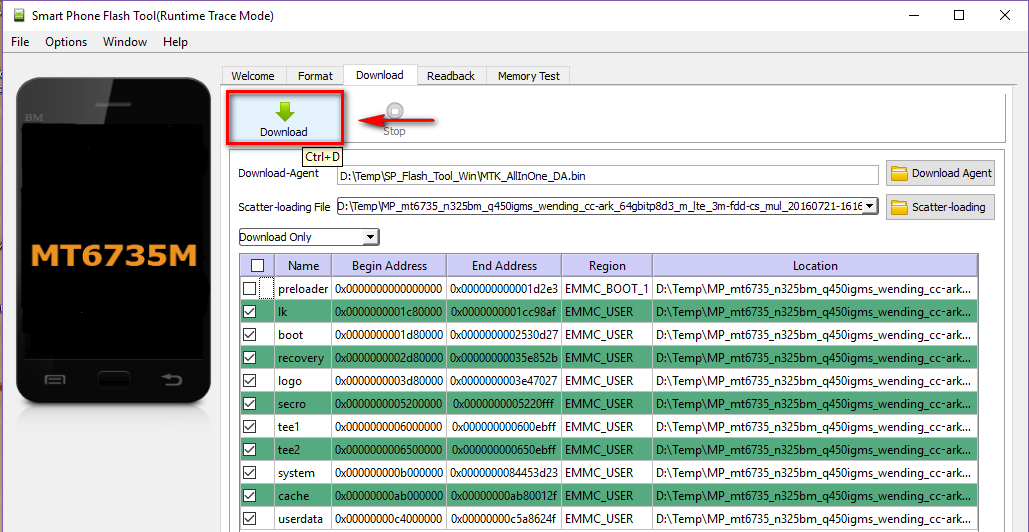 3. Запустить SPFlashTool, нажать кнопку scatter-loading и выбрать файл MT6735M_Android_scatter.txt из папки TWRP_Root_ARK_Benefit_M8