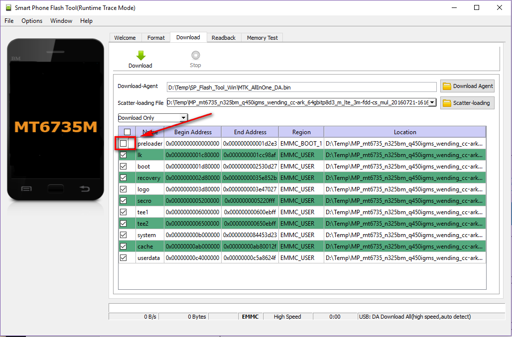 Если пробегает красная полоса и выскакивает ошибка связанная с PMT -> смените режим прошивки на Firmware-Upgrade (галочку на preloader нужно поставить в этом режиме), если какая-то другая ошибка -> Ошибки SP Flash Tool