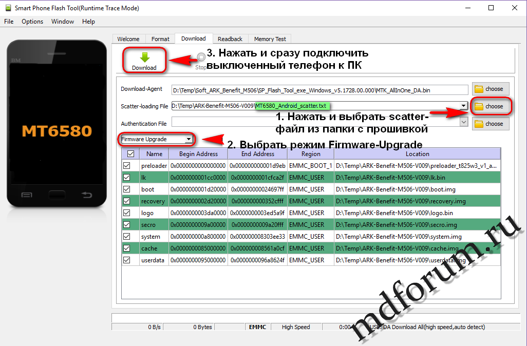 - в поле scatter-file выбрать файл MT6580_Android_scatter, который находится в папке с распакованной прошивкой