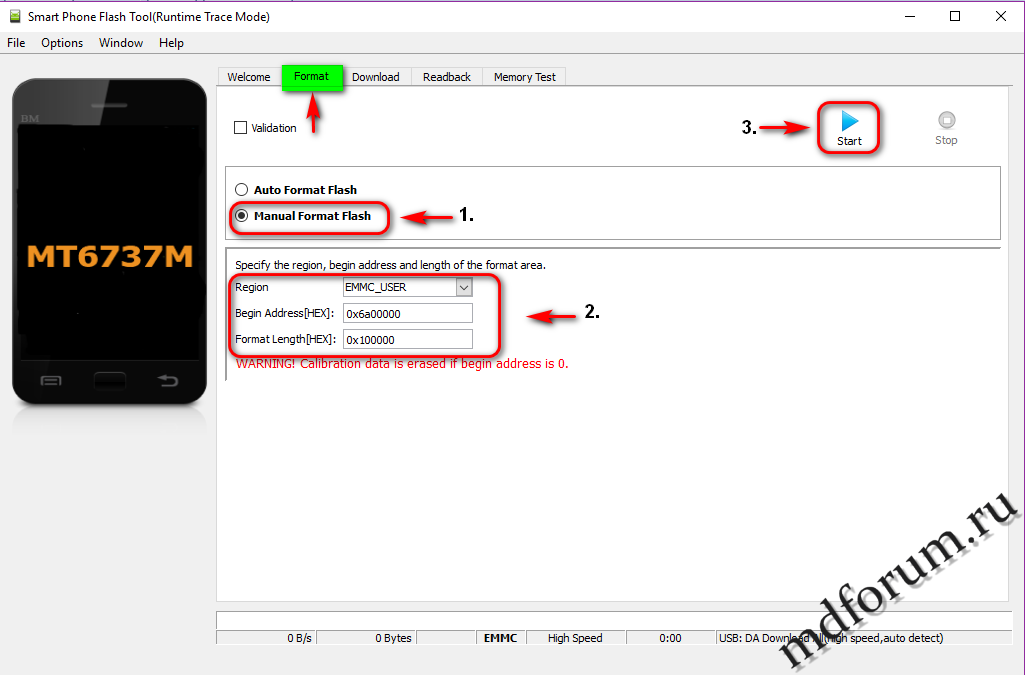 4. После того, как выбрали файл переходи во вкладку Format, отмечаете точкой "Manual Format Flash" и вставляете следующие значения: