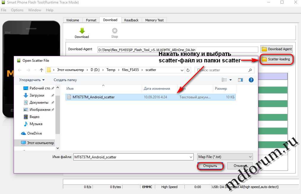 3. Запускаете SPFlashTool. Нажимаете кнопку scatter-loading и выбираете файл MT6737M_Android_scatter.txt из папки scatter.