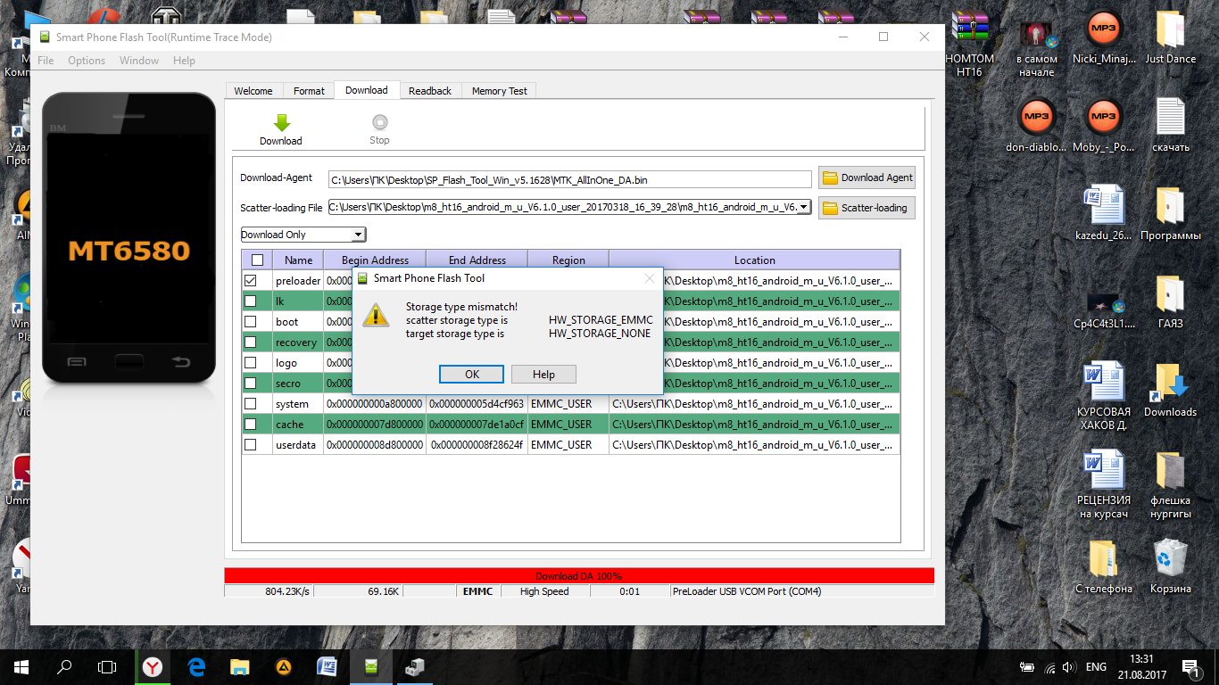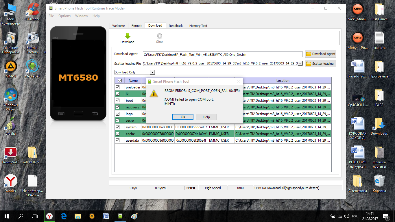 И последнее что я сделал: я скачал самую последнюю прошивку для моего смарта с официального сайта и попробовал ее прошить(версия флеш тул та же: 5.1628), однако уже на этот раз после того как прошла красная полоска вышла ошибка brom error s ft enable dram fail 0xfc0