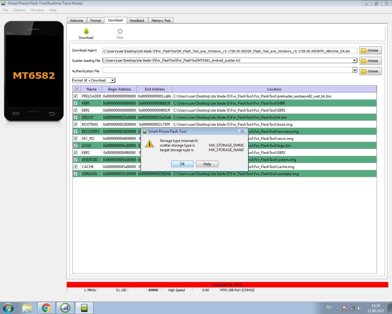 тебе флэштул пишет, что в телефоне память NAND, а разметка в scatter-файле для памяти EMMC
