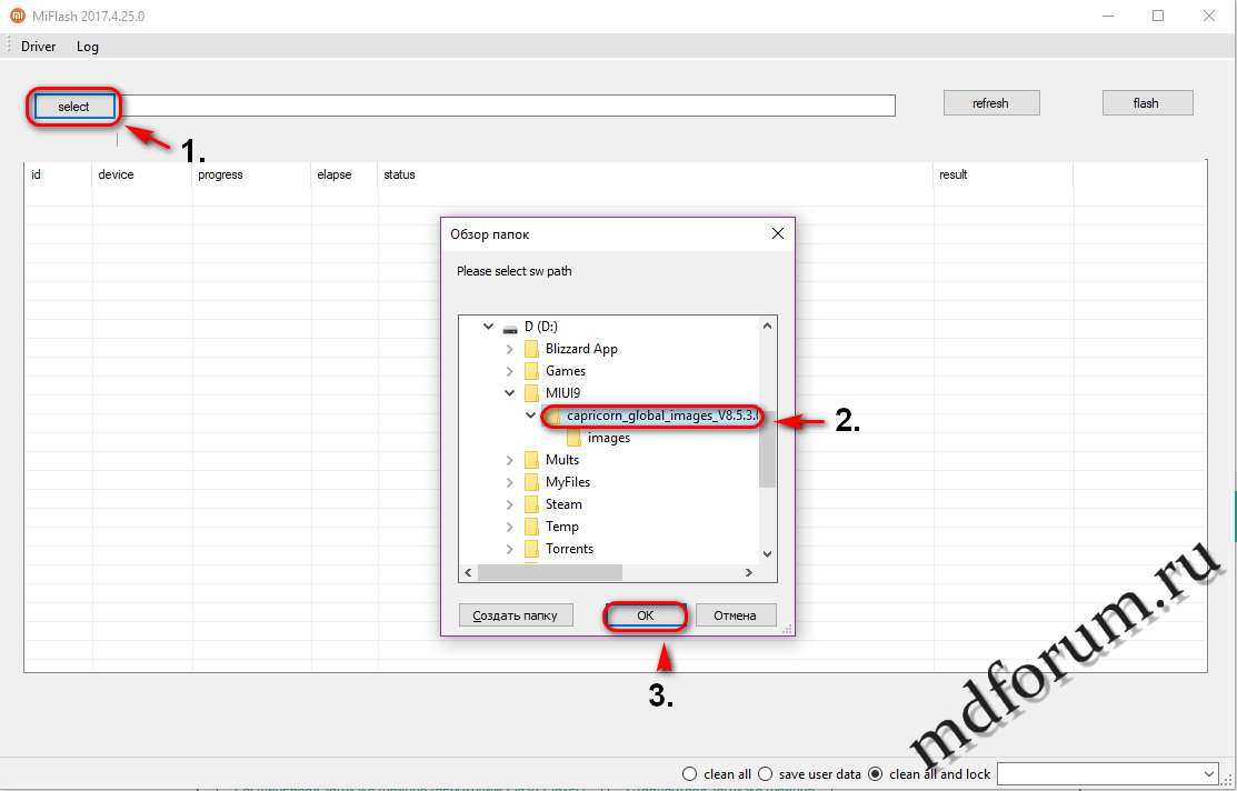 2. Запустить MiFlash, нажать "select" и указать путь к папке, где находятся все файлы прошивки: