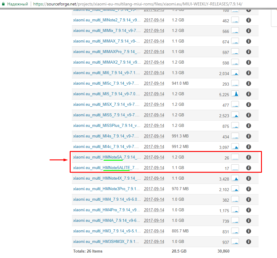 - Далее открываете папку с самой свежей версией и ищите архив, где есть в имени HMNote5A (для версии Prime с отпечатком пальца) или HMNote5ALITE (для версии без отпечатка пальца). Не нашли? ищите в другой папке, если нет версии stable -> ищите еженедельную. Скриншот: