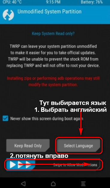 5. Запускаете файл Flash_TWRP.bat и жмёте любую кнопку на клавиатуре, когда вас об этом попросят (надпись "press any key to continue ..."), в самом конце запустится TWRP, оно будет на китайском, выбираете английский язык и проводите пальцем вправо внизу экрана ("swipe to allow modification"):
