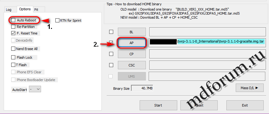 2. Запустить Odin.exe. Открыть вкладку "Options" и снять галочку с Auto-reboot. Затем нажать кнопку AP и выбрать файл *.tar с twrp.