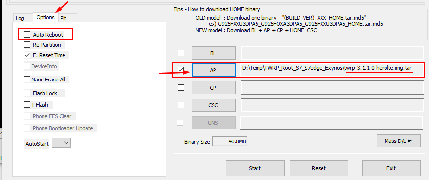 6. Запустить Odin.exe, открыть вкладку Options и снять галочку с Auto-Reboot. Затем нажать на кнопку "AP" и выбрать файл twrp-3.1.1-0-herolte.img.tar