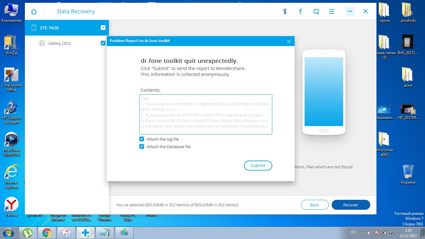 Сообщение от ektomorf ну вот на другом компе поставил прогу и стала запускаться. И вроде нашла фотки и нажимаю востонавить и вот выдает что то. смотри скрин: ошибка какая-то, я не знаю, что за она, тебе предложено отправить лог разработчикам