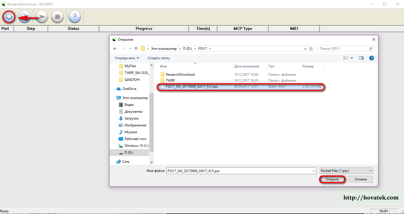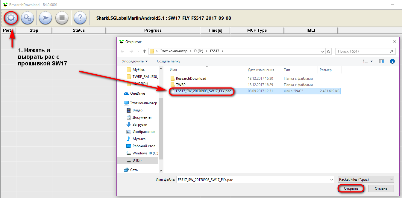 2. Запускаете ResearchDownload. Выбираете "pac" с прошивкой (sw17) нажав на одну шестерёнку.