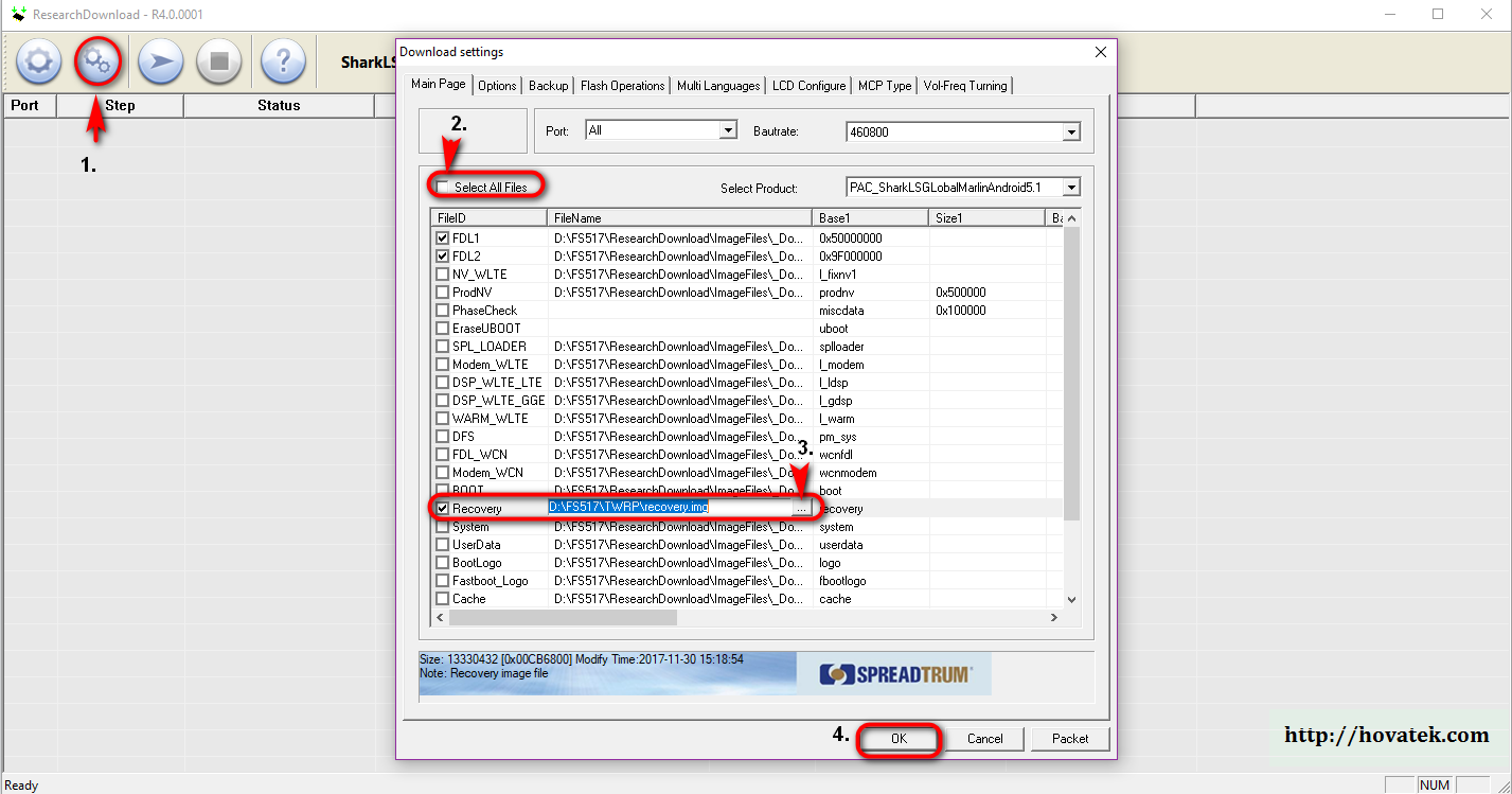 - отмечаете блок "recovery" галочкой, рядом где указан путь нажимаете двойным щелчком мыши, жмёте три точки и выбираете файл "recovery.img" из папки TWRP (которая находится в FS517_files)