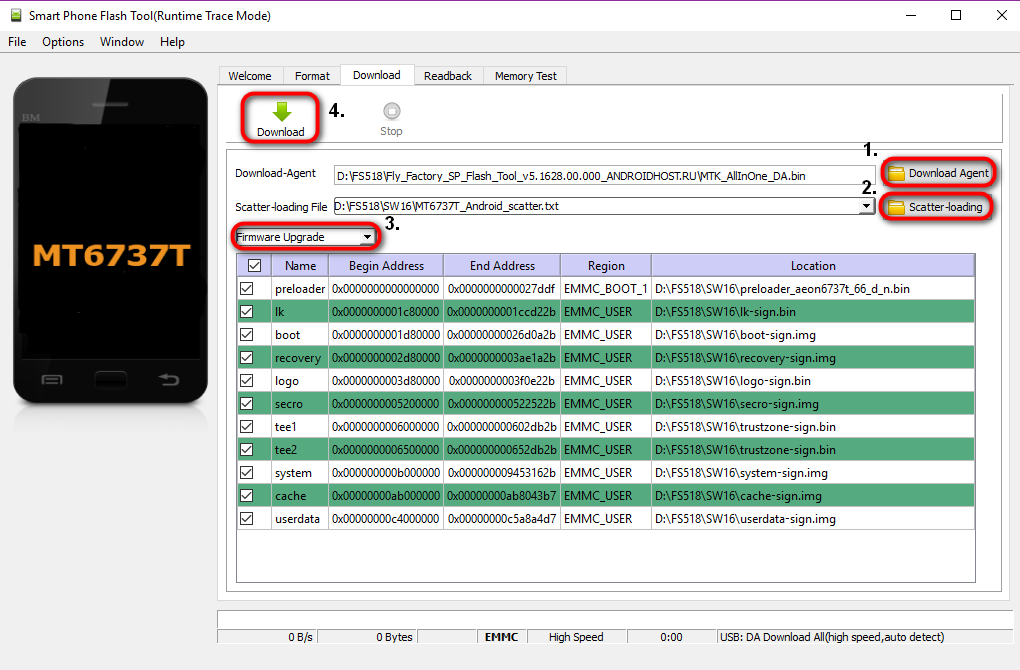 1. Запустить Sp Flash Tool. Выбрать Download agent и scatter файл (как написано выше).