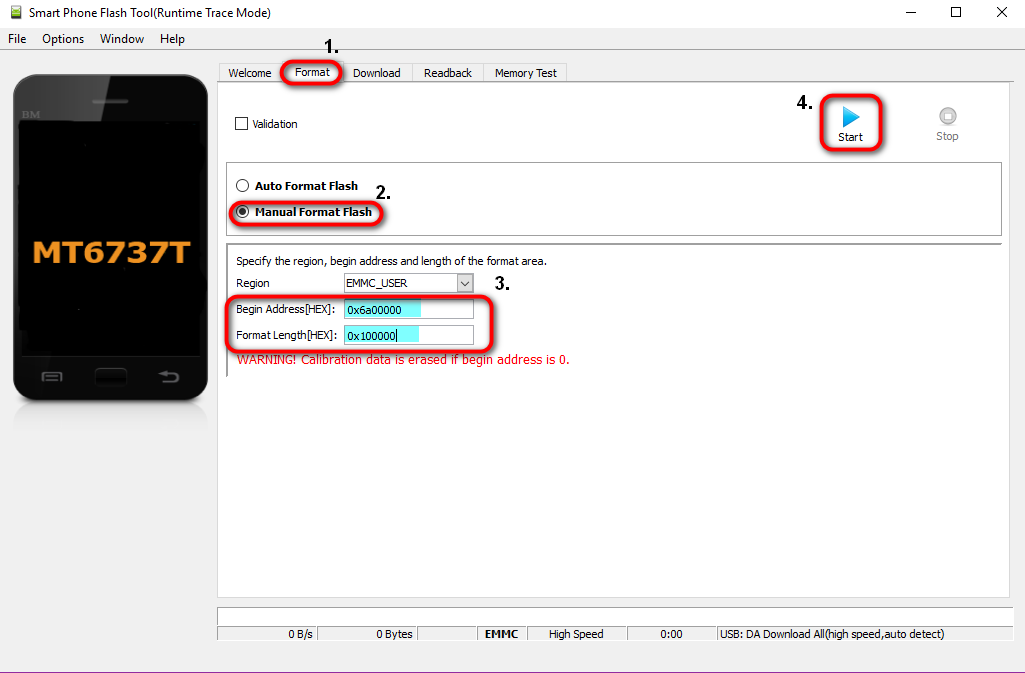 4. Нажать Start и сразу подключить выключенный смартфон к ПК. Дождаться окончания форматирования.