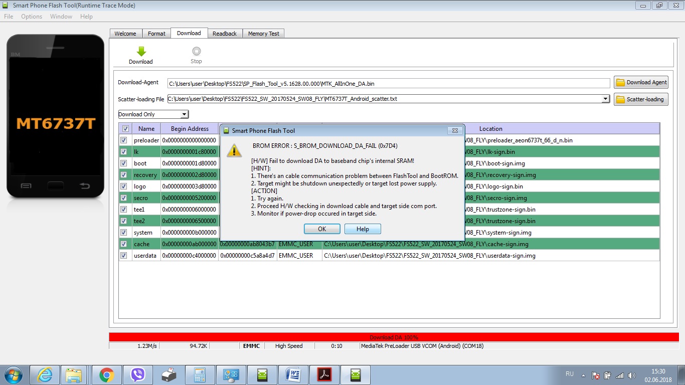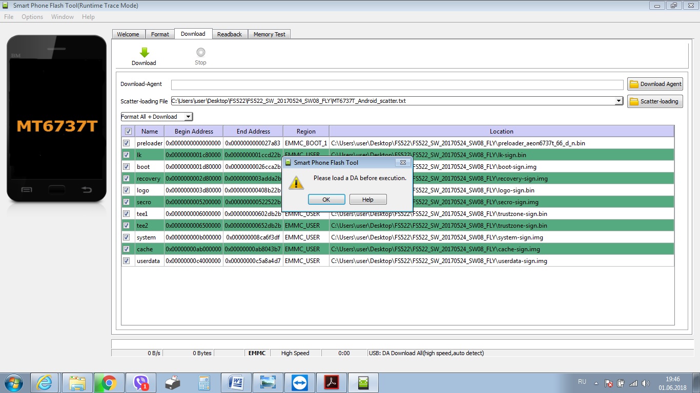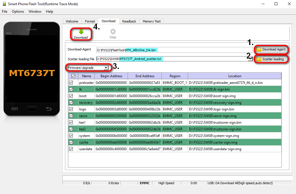 4. Выбрать файл MTK_AllInOne_DA.bin нажав кнопку "Download agent". Затем нажать на scatter-loading и выбрать файл MT6737T_Android_scatter.txt из папки с прошивкой.