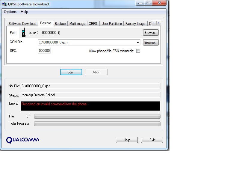 9. После того, как поменяли имеи, запускаем прогу "Software Download", в ней выбираем RESTORE, выбираем файлик imei.qcn и прошиваем его.