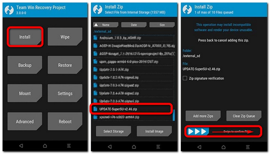 5. Затем выбрать пункт Install -> найти ранее помещённый архив SuperSU.zip в проводнике, выбрать его и установить. Сразу, таким же образом, установить и архив no-verity-opt-encrypt-6.0.zip.