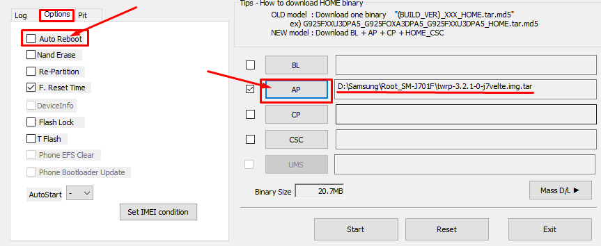 6. Запустить Odin3 v3.12.7.exe из папки с файлами. Открыть вкладку опций и снять галочку с пункта "Auto Reboot". Затем нажать на кнопку "AP" и выбрать файл twrp-3.2.1-0-j7velte.img.tar